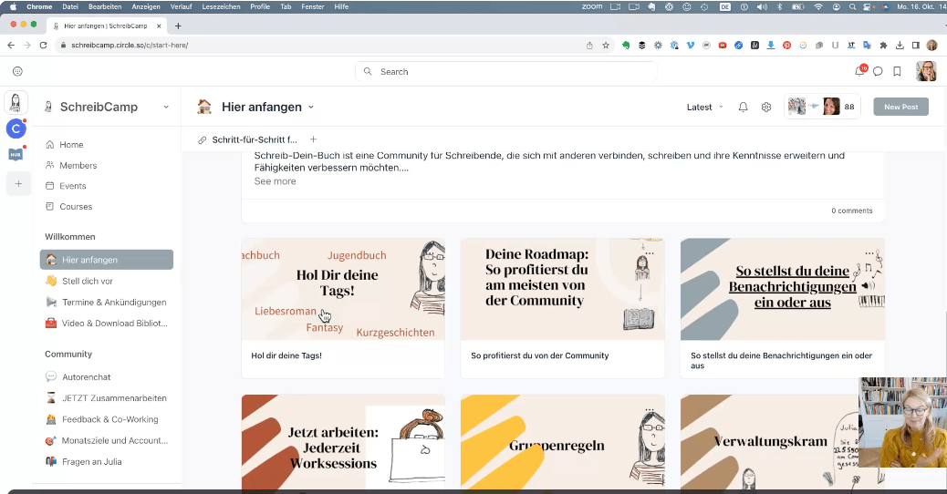 Wir beginnen am (*Trommelwirbel*) 13. Oktober. An dem Tag bekommst du den Zugang zum *brandneuen* Schreib-Camp-Portal. Mir gefällt die Plattform super, übersichtlich (besser als Facebook und Discord etc.), aber konversationsfreundlich. Dazu keine Ablenkung von Social Media und Werbung. Die Plattform ist auch für mich neu und sie bietet tolle Features für eine Community, die man auch immer weiter anpassen kann. Wir sind aktuell über 100 Mitschreiber.